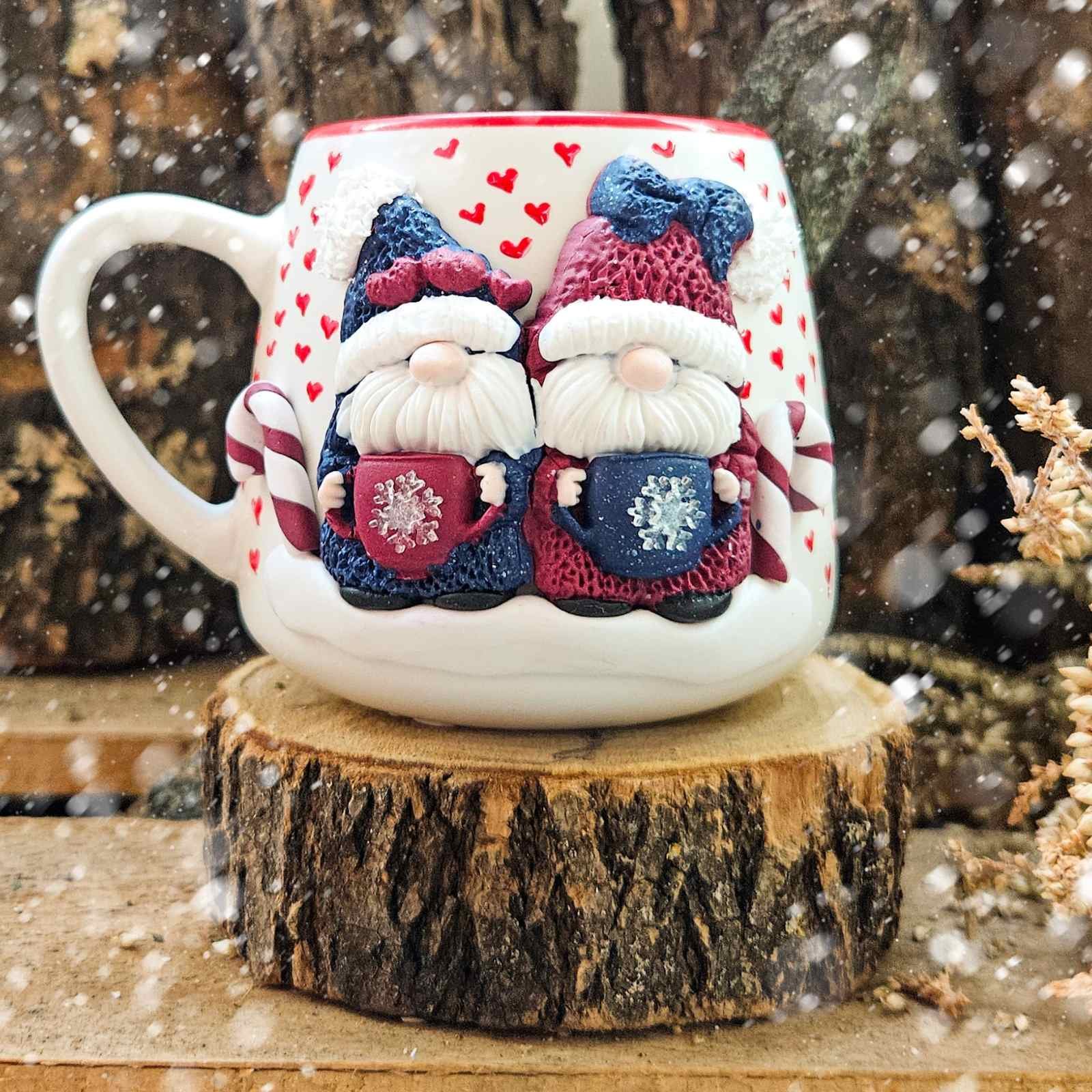 Kерамична чаша с гномче и коледни мотиви, изработени от полимерна глина. Чашата е декорирана изцяло ръчно и е единична бройка.