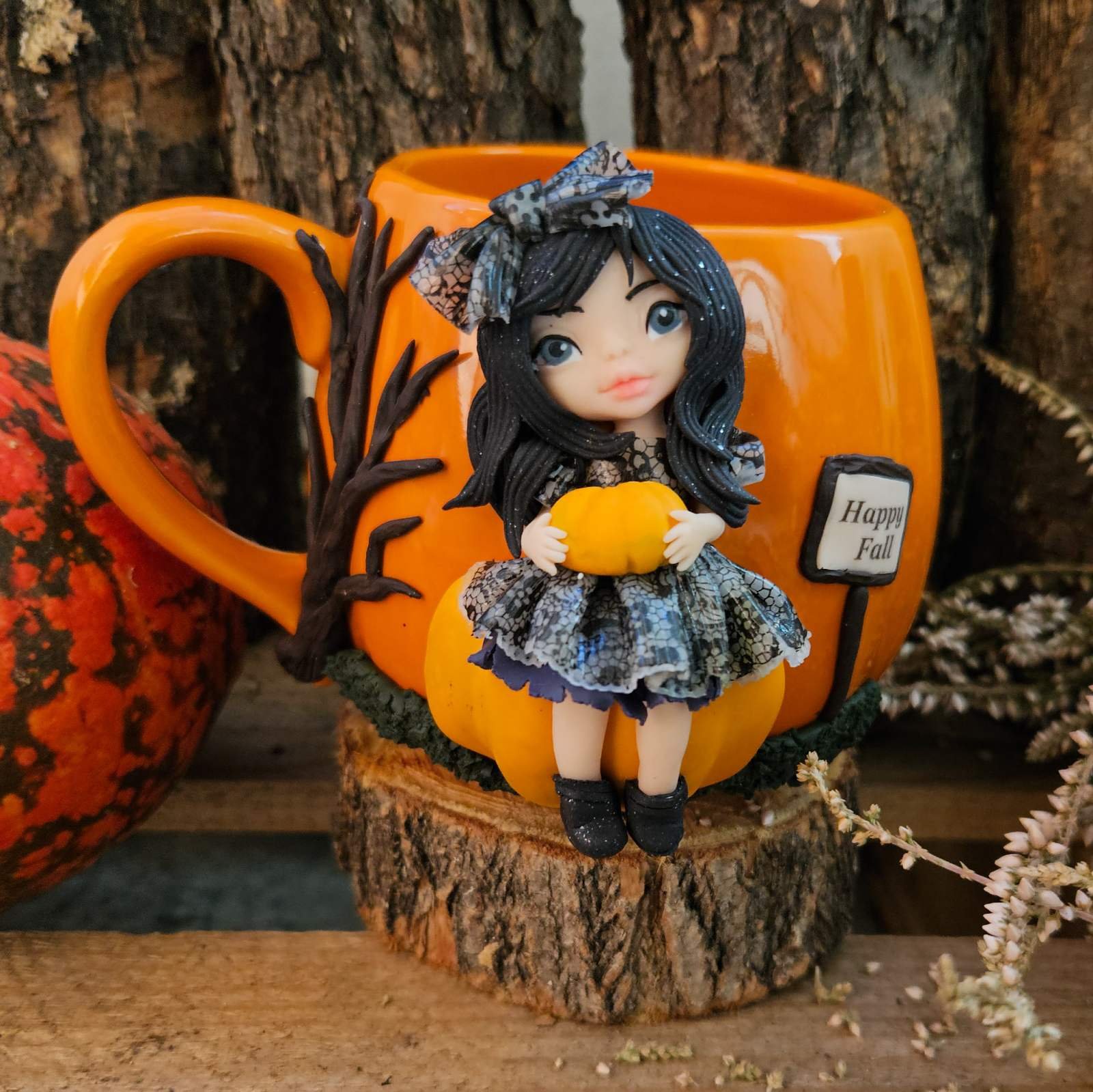 Релефна керамична чаша с ръчно изработена декорация от полимерна глина