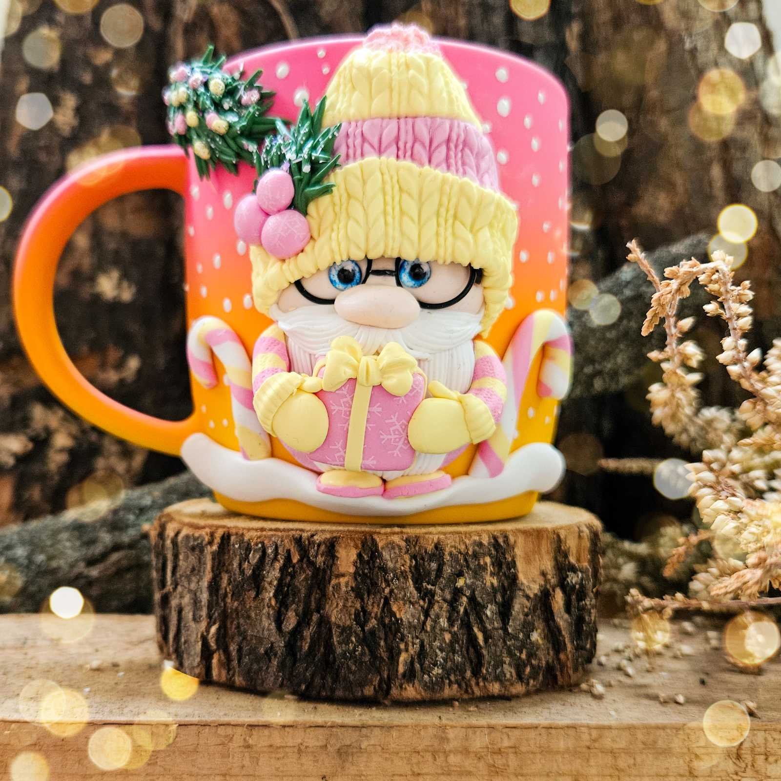 Kерамична чаша с гномче и коледни мотиви, изработени от полимерна глина. Чашата е декорирана изцяло ръчно и е единична бройка.