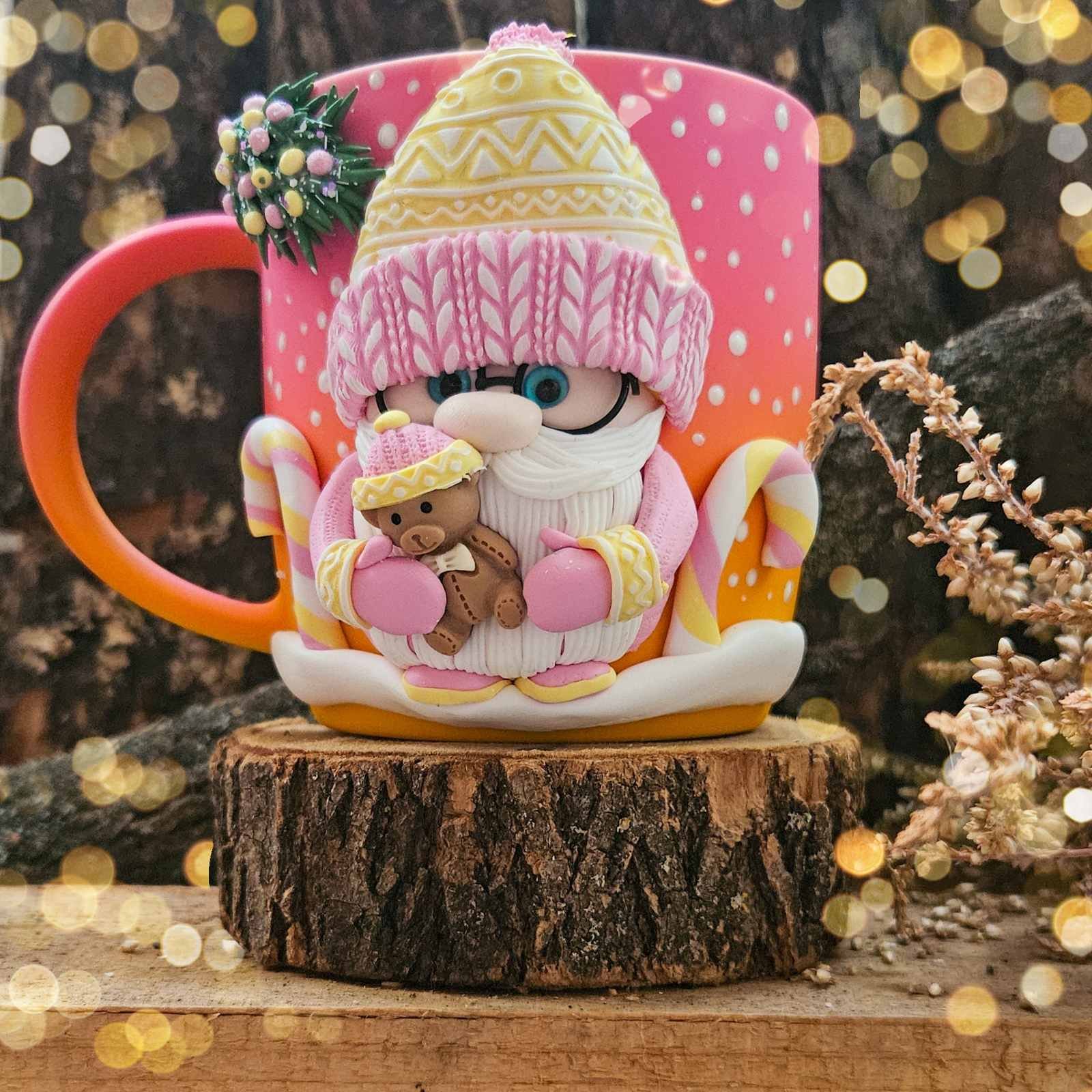 Kерамична чаша с гномче и коледни мотиви, изработени от полимерна глина. Чашата е декорирана изцяло ръчно и е единична бройка.