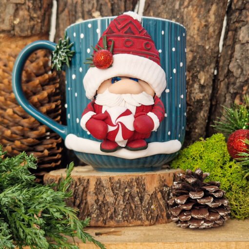 Керамична чаша с коледно гномче, изработено от полимерна глина. Чашата е декорирана изцяло ръчно и е единична бройка.