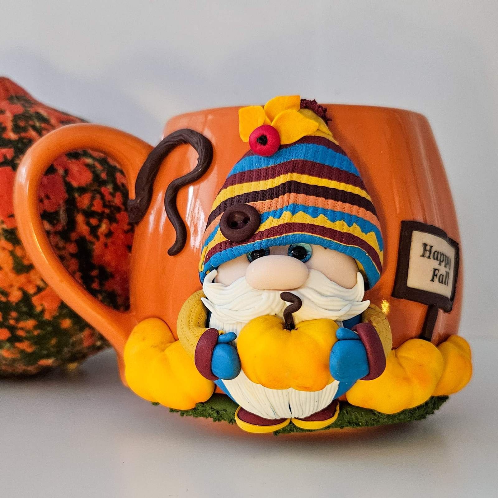 Керамична чаша с есенно гномче, изработено от полимерна глина. Чашата е декорирана изцяло ръчно и е единична бройка.