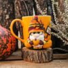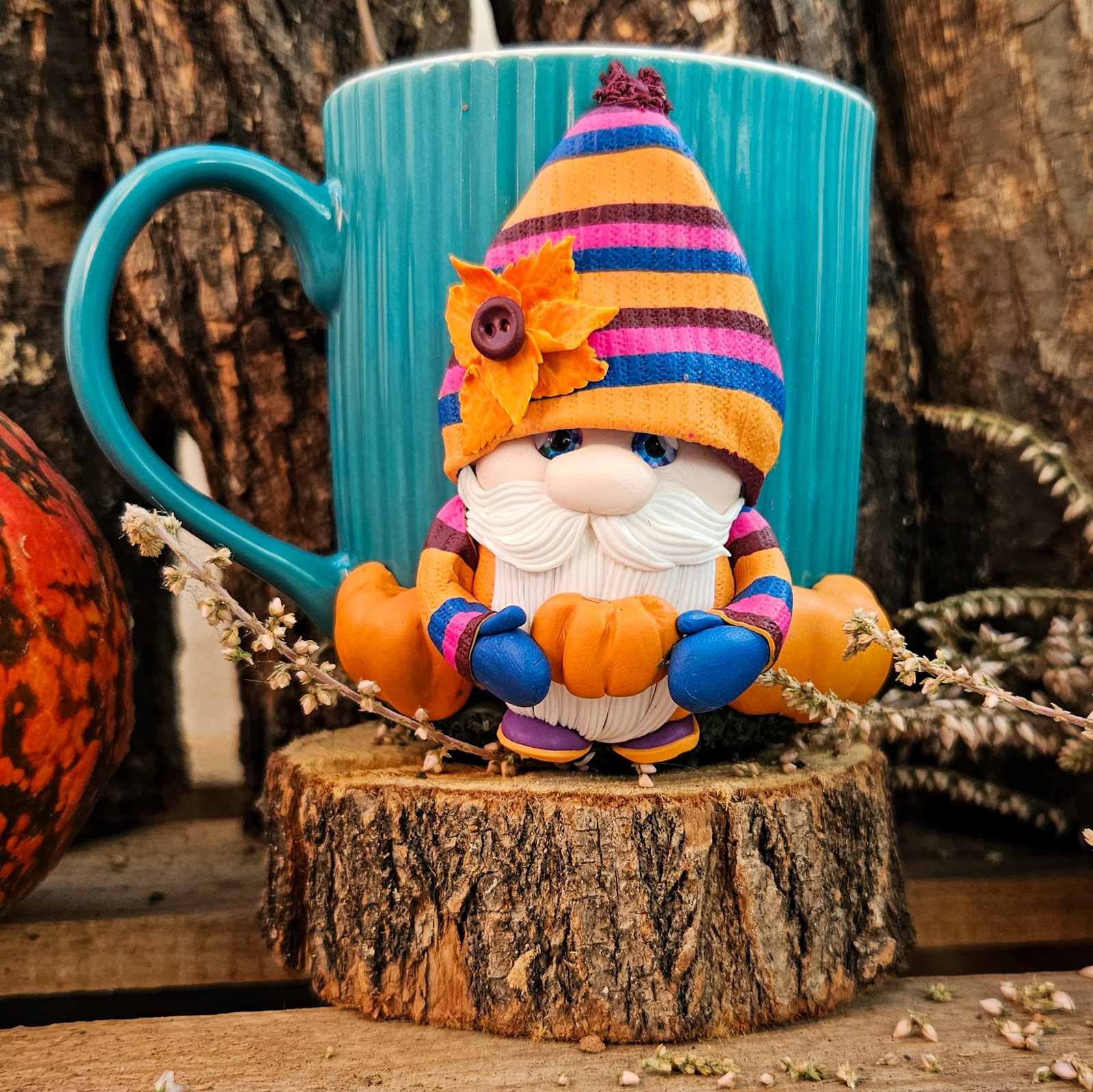 Релефна керамична чаша с есенно гномче, изработено от полимерна глина. Чашата е декорирана изцяло ръчно и е единична бройка.